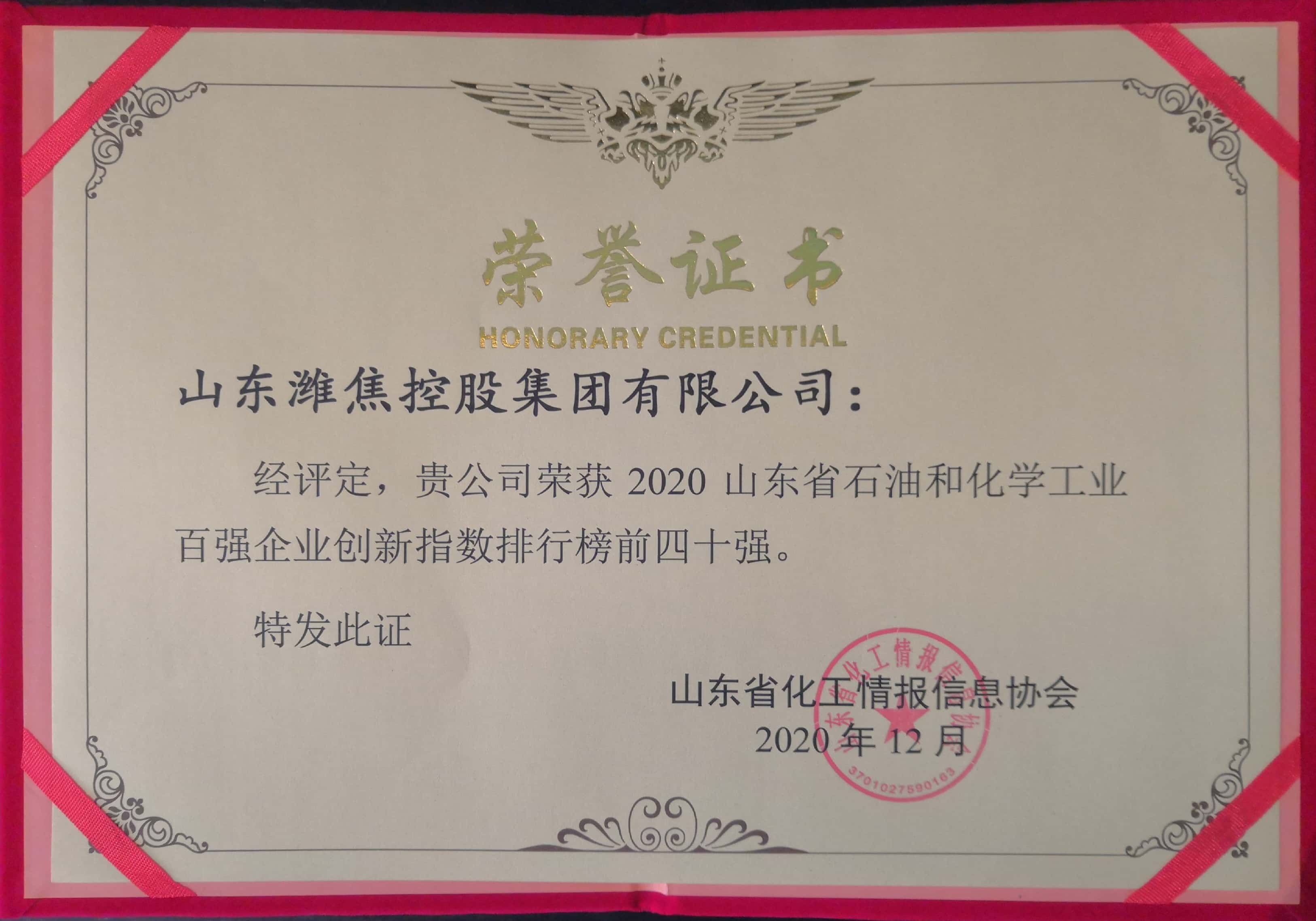 12月16日至17日,由山東省化工情報信息協(xié)會主辦的2020(第十屆)中國化工產(chǎn)學研高峰論壇在東營廣饒召開。會上,集團公司榮獲“2020山東省石油和化學工業(yè)100強企業(yè)”稱號,并在百強企業(yè)創(chuàng)新指數(shù)排行榜位列35位。